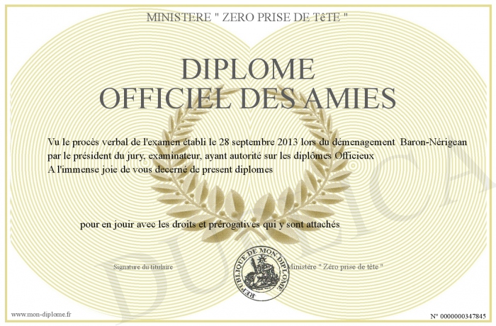 Envoyez par email votre Diplôme OFFICIEL des Amies personalisé