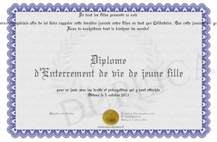 Envoyez par email votre Diplome d'Enterrement de vie de jeune fille personalisé