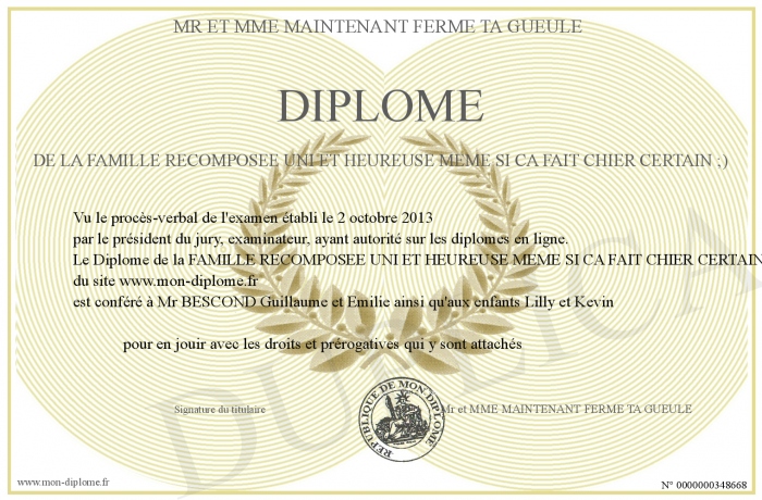 Envoyez par email votre Diplôme de la FAMILLE RECOMPOSEE UNI ET HEUREUSE MEME SI CA FAIT CHIER CERTAIN ;) personalisé