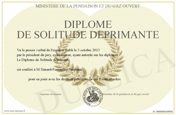 Envoyez par email votre Diplome de Solitude déprimante personalisé