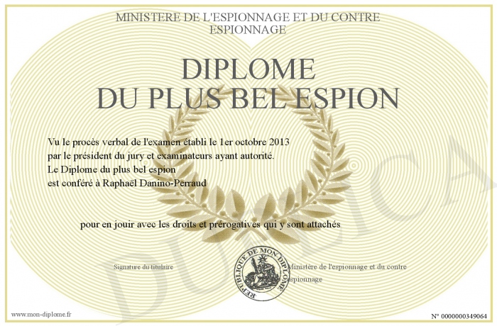Envoyez par email votre Diplôme du plus bel espion personalisé