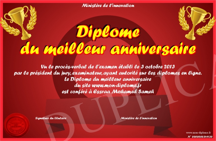 Envoyez par email votre Diplôme du meilleur anniversaire personalisé