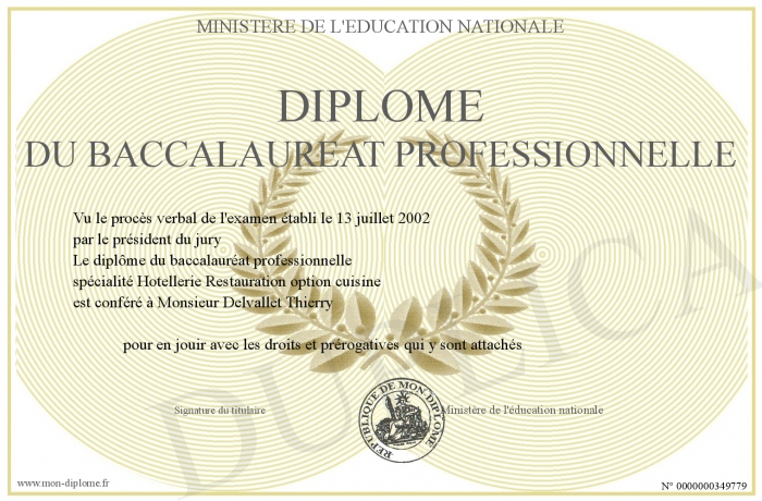 Envoyez par email votre Diplôme du baccalaureat Professionnelle personalisé