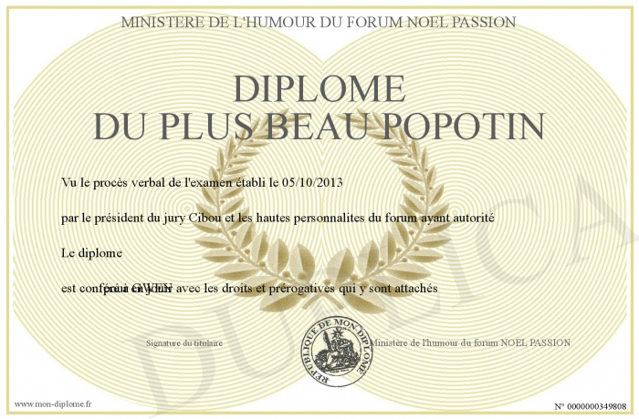 Envoyez par email votre diplome DU PLUS BEAU POPOTIN personalisé