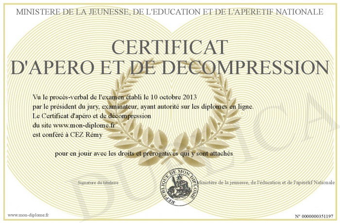 Envoyez par email votre Certificat d'apéro et de décompression personalisé
