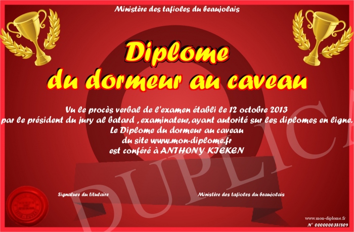 Envoyez par email votre Diplôme du dormeur au caveau personalisé