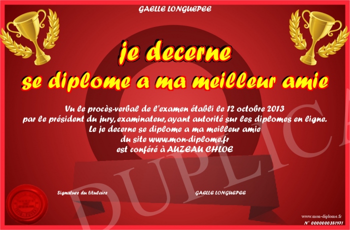 Envoyez par email votre je decerne se diplome a ma meilleur amie personalisé