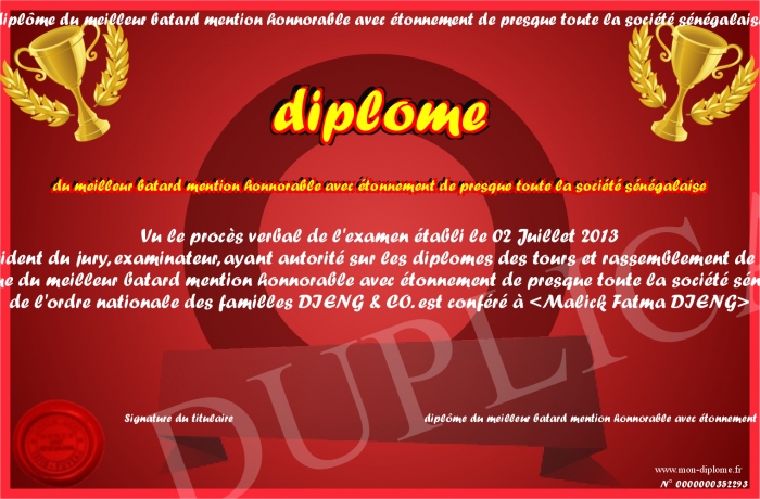 Envoyez par email votre diplôme du meilleur batard mention honnorable avec étonnement de presque toute la société sénégalaise personalisé