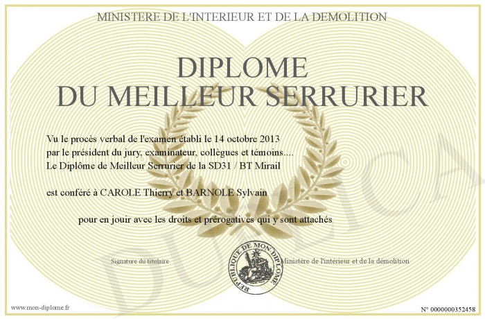 Envoyez par email votre Diplôme du Meilleur Serrurier personalisé