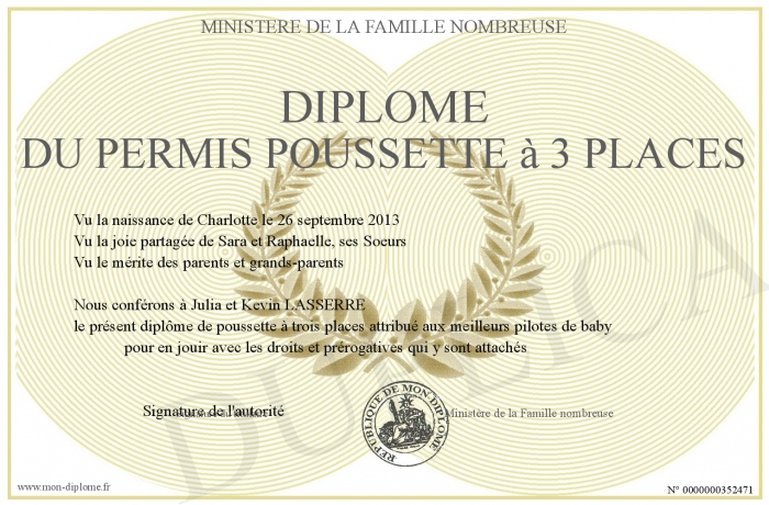 Envoyez par email votre Diplôme du permis poussette à 3 places personalisé