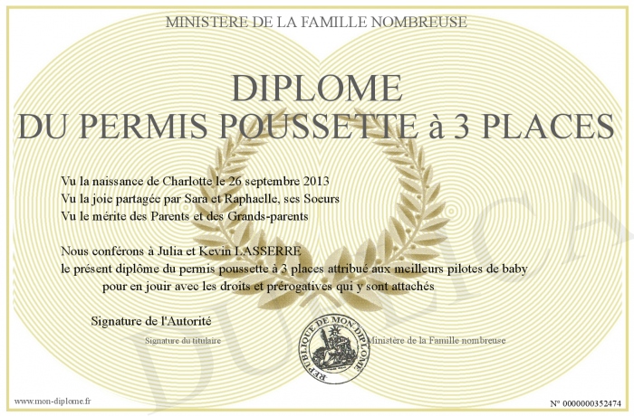 Envoyez par email votre Diplôme du permis poussette à 3 places personalisé