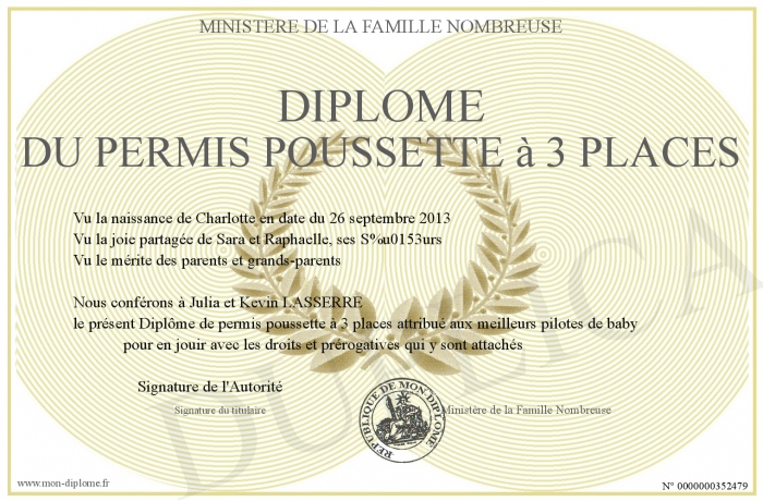 Envoyez par email votre Diplôme du Permis poussette à 3 places personalisé