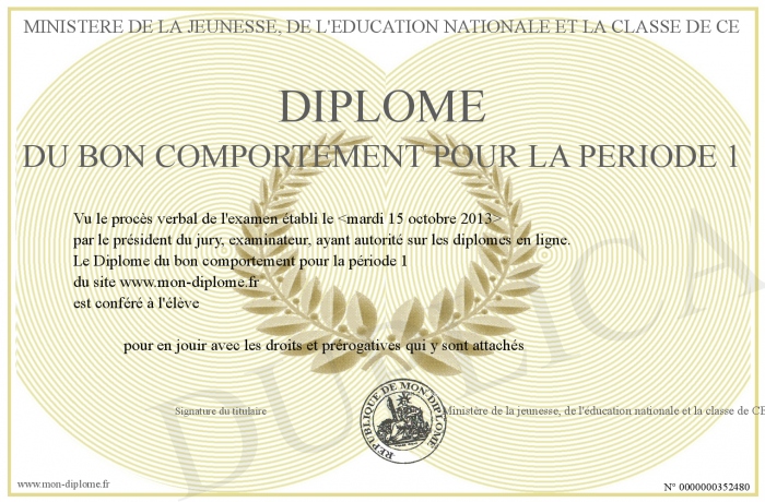 Envoyez par email votre Diplôme du bon comportement pour la période 1 personalisé
