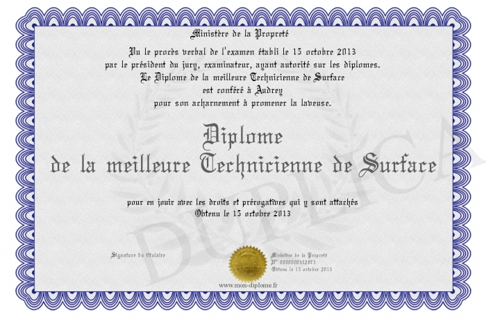 Envoyez par email votre Diplôme de la meilleure Technicienne de Surface personalisé