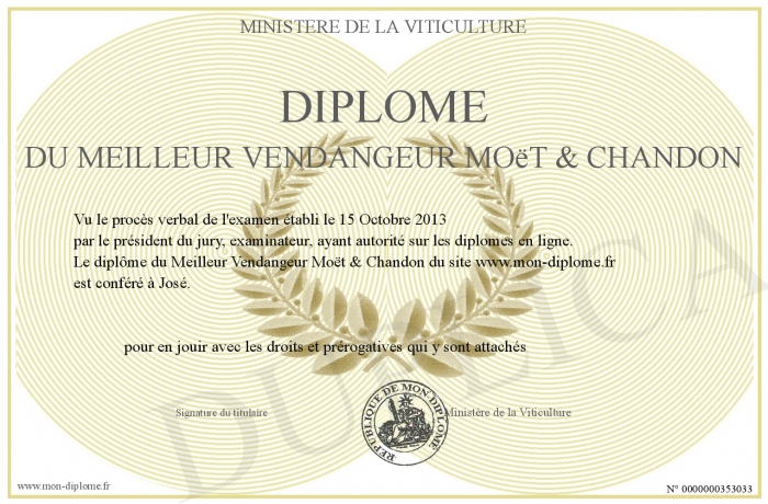 Envoyez par email votre Diplôme du Meilleur Vendangeur Moët & Chandon personalisé