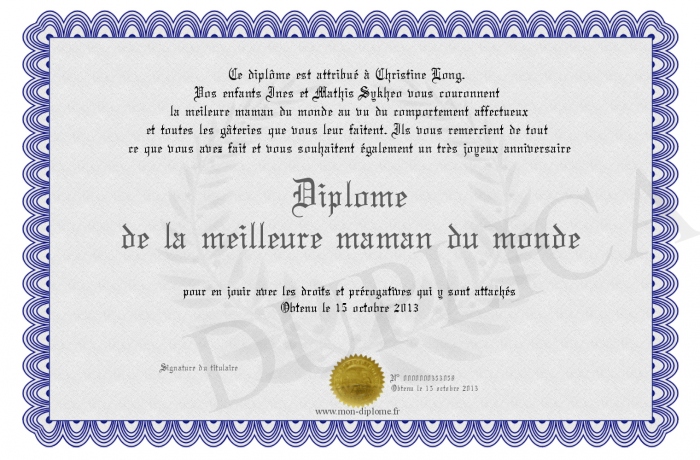 Envoyez par email votre Diplôme de la meilleure maman du monde personalisé