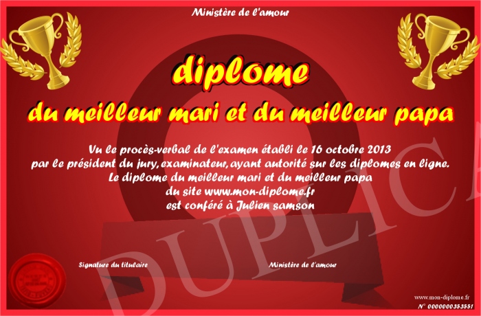 Envoyez par email votre diplôme du meilleur mari et du meilleur papa personalisé