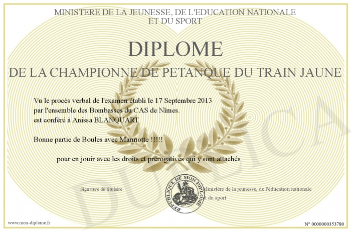 Envoyez par email votre Diplôme de la Championne de Pétanque du train Jaune personalisé
