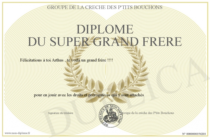 Envoyez par email votre Diplôme du Super Grand Frère personalisé