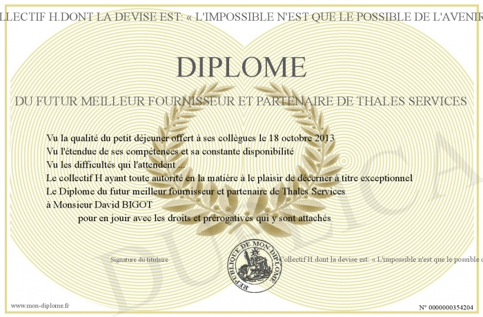 Envoyez par email votre Diplôme du futur meilleur fournisseur et partenaire de Thales Services personalisé