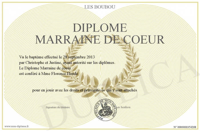 Envoyez par email votre Diplôme Marraine de coeur personalisé