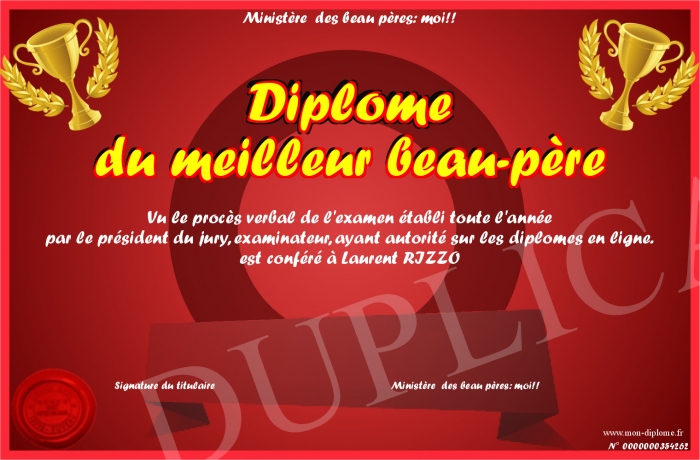 Envoyez par email votre Diplôme du meilleur beau-père personalisé