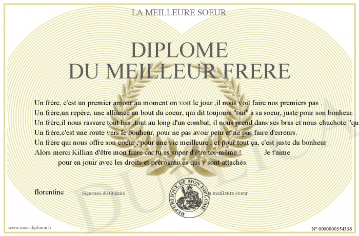 Envoyez par email votre Diplôme du meilleur frere personalisé