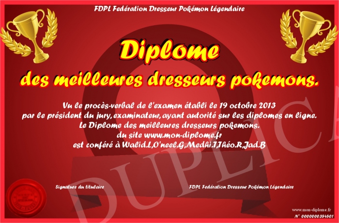 Envoyez par email votre Diplôme des meilleures dresseurs pokemons. personalisé