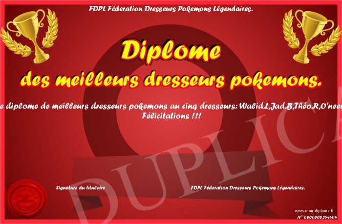 Envoyez par email votre Diplôme des meilleurs dresseurs pokemons. personalisé