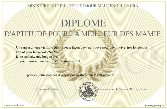 Envoyez par email votre Diplome d'aptitude pour la meilleur des mamie personalisé