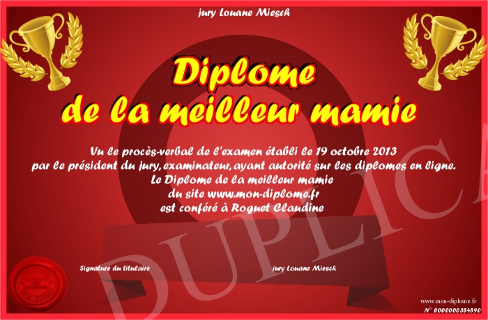 Envoyez par email votre Diplôme de la meilleur mamie personalisé