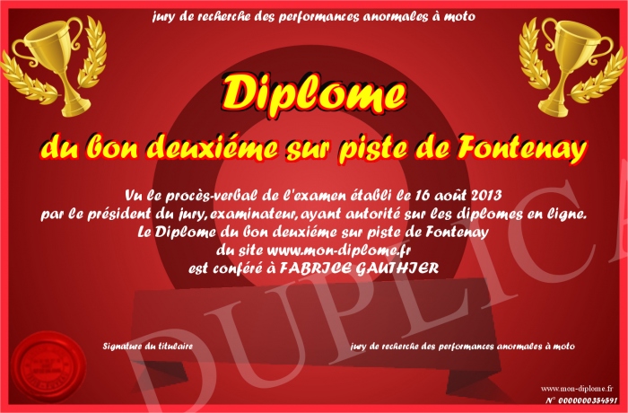 Envoyez par email votre Diplôme du bon deuxiéme sur piste de Fontenay personalisé