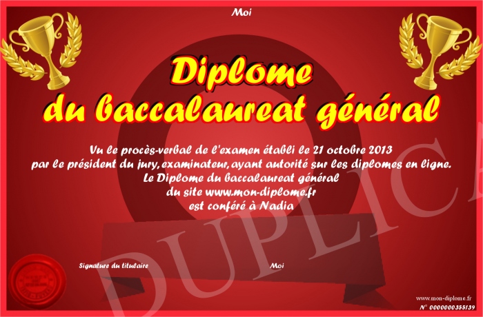 Envoyez par email votre Diplôme du baccalaureat général personalisé