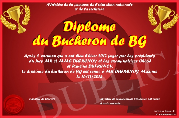 Envoyez par email votre Diplôme du Bucheron de BG personalisé