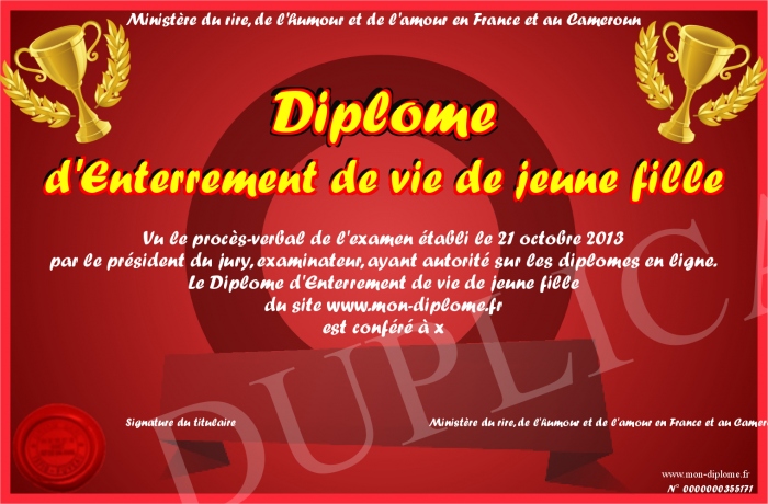 Envoyez par email votre Diplome d'Enterrement de vie de jeune fille personalisé