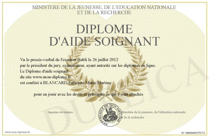 Envoyez par email votre Diplôme d'aide soignant personalisé