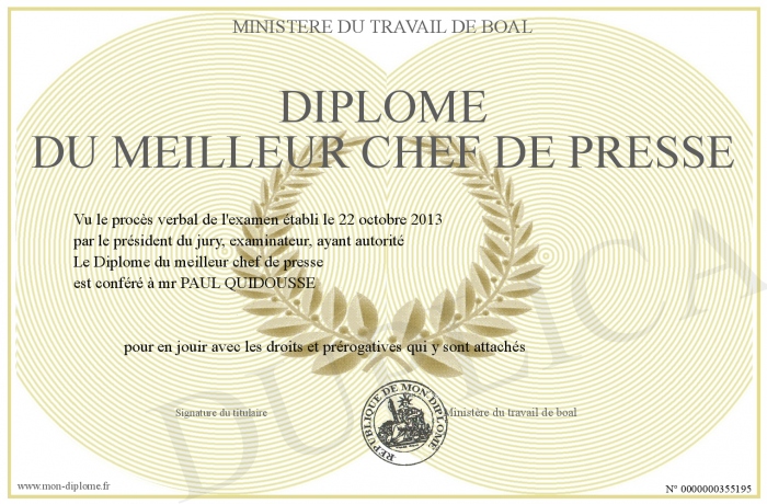 Envoyez par email votre Diplôme du meilleur chef de presse personalisé