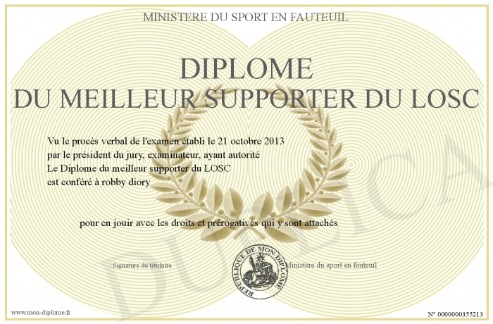 Envoyez par email votre Diplôme du meilleur supporter du LOSC personalisé