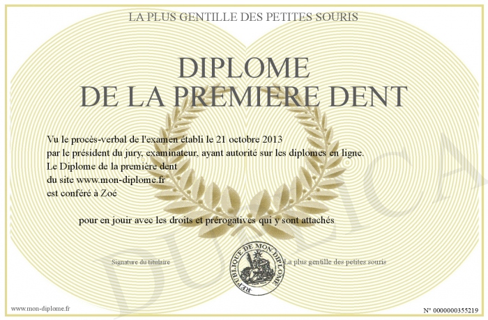 Envoyez par email votre Diplôme de la première dent personalisé