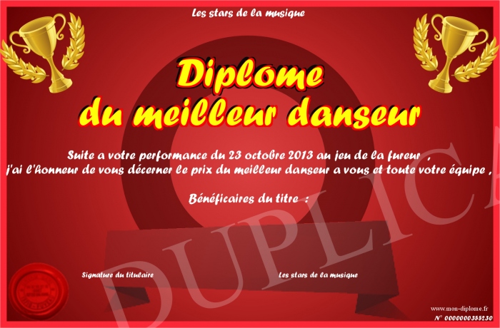 Envoyez par email votre Diplome du meilleur danseur personalisé