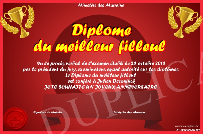 Envoyez par email votre Diplôme du meilleur filleul personalisé