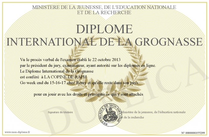 Envoyez par email votre Diplôme International de la Grognasse personalisé