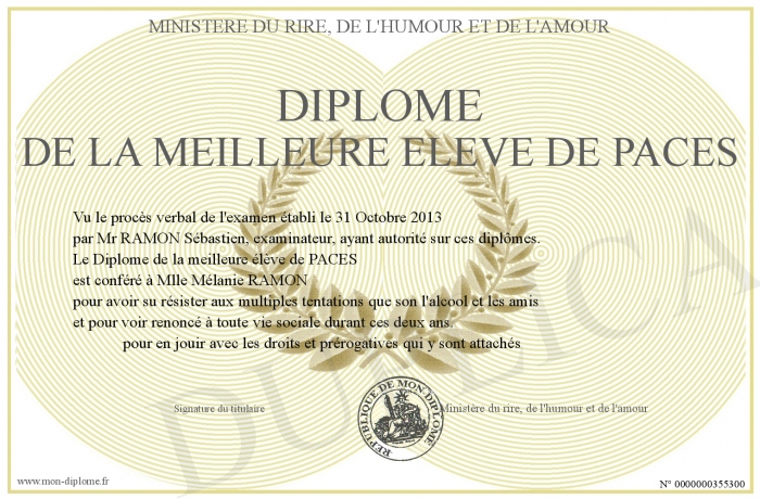 Envoyez par email votre Diplôme de la meilleure élève de PACES personalisé