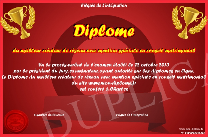 Envoyez par email votre Diplôme du meilleur créateur de réseau avec mention spéciale en conseil matrimonial personalisé