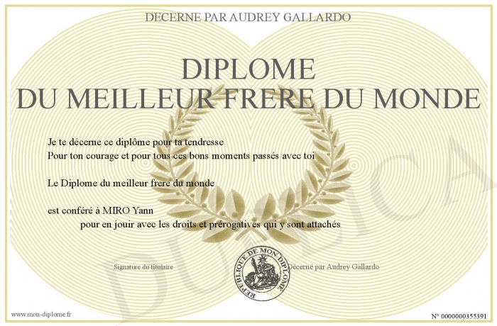 Envoyez par email votre Diplôme du meilleur frere du monde personalisé