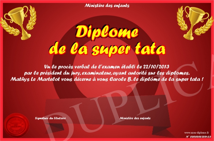 Envoyez par email votre Diplôme de la super tata personalisé