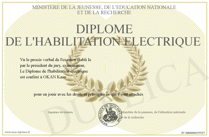 Envoyez par email votre Diplôme de l'habilitation electrique personalisé