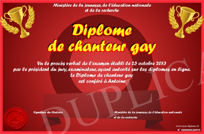 Envoyez par email votre Diplôme de chanteur gay personalisé