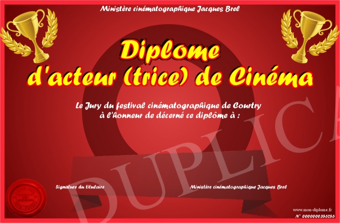 Envoyez par email votre Diplôme d'acteur (trice) de Cinéma personalisé