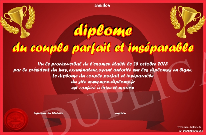 Envoyez par email votre diplome du couple parfait et inséparable personalisé